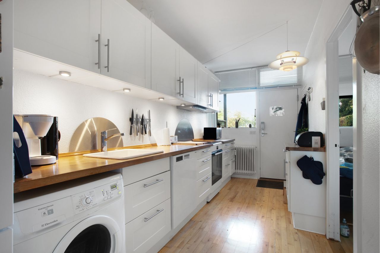 første træder ind i et lyst og moderne køkken med masser af god skabsplads og en hyggelig