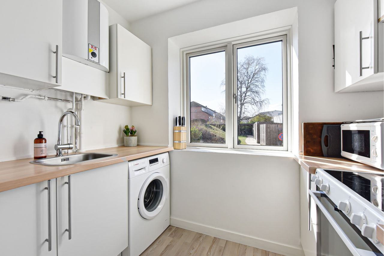 hvide flader. Det gemmer på rig opbevaringsplads; du får endda plads til vaskemaskinen under