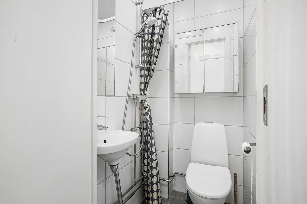 Indretning: God fordelingsentre med adgang til et flot og mindre flisebadeværelse - Rummeligt elementkøkken med god skabsplads - soveværelse mod gården - Stor opholdsstue med plads til spisebord, sofaarrangement og det store tv på væggen.
