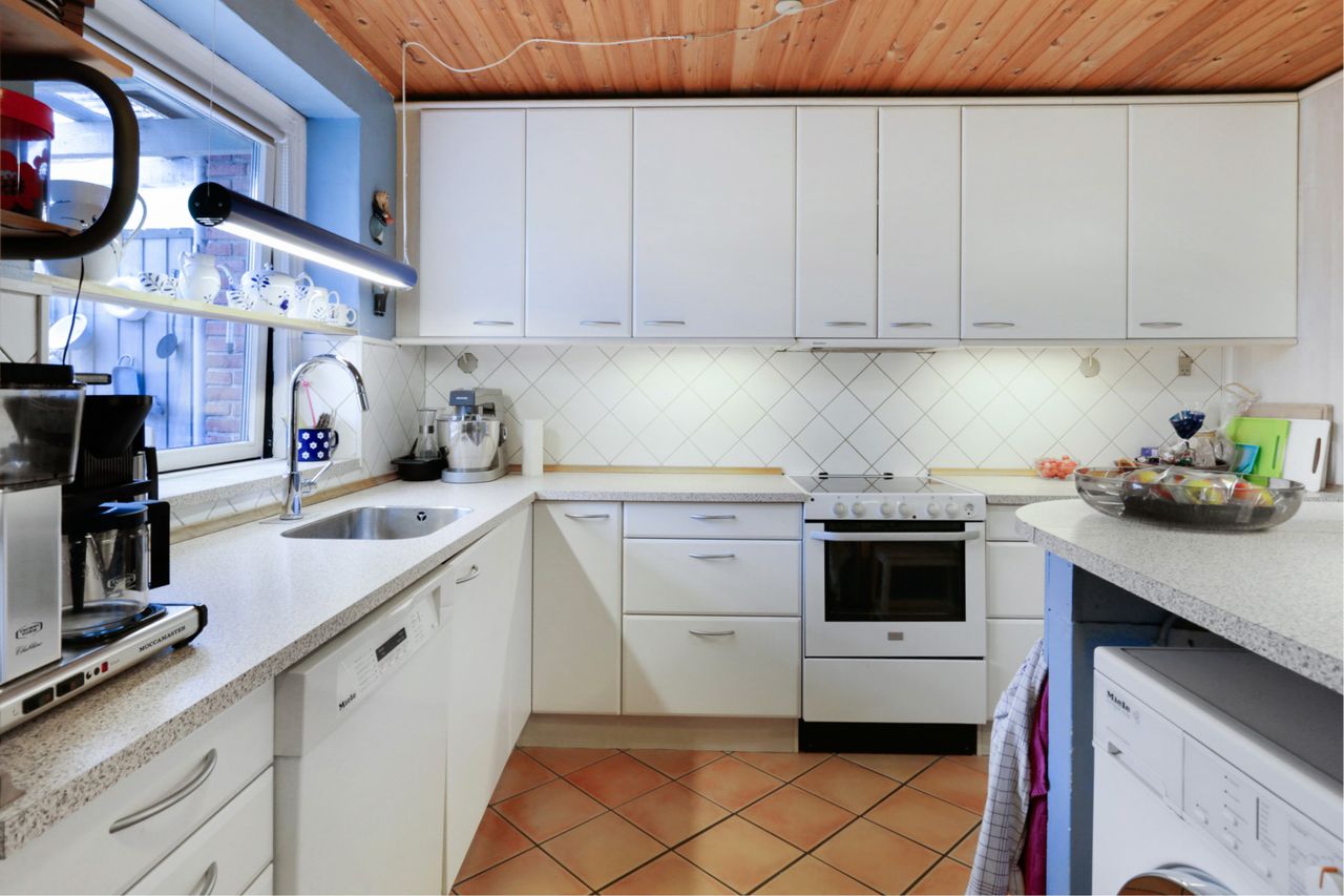 hele familiens sko og jakker. Et godt gæstetoilet i mørke farver - Et dejligt stort vinkelkøkken med masser