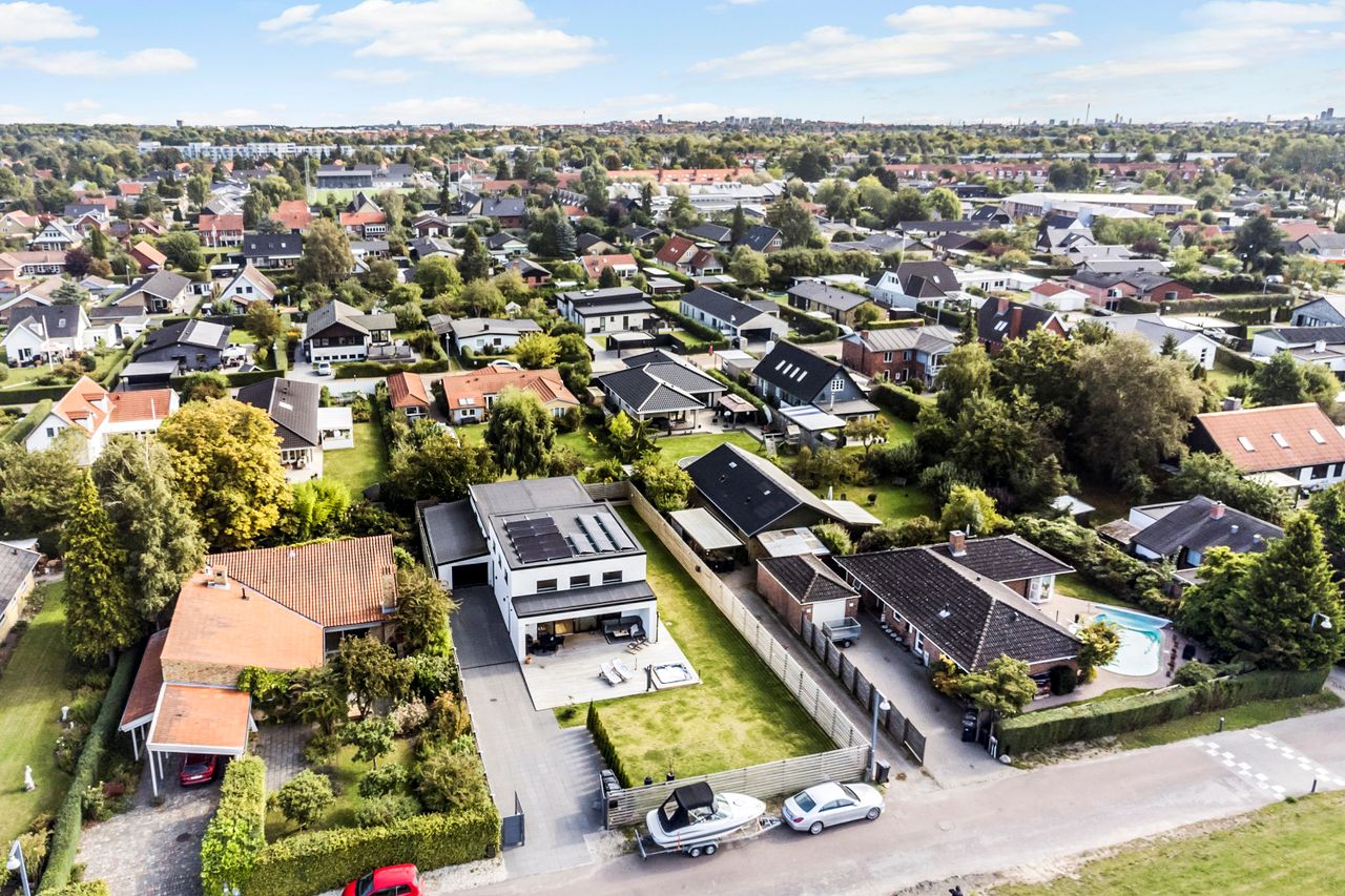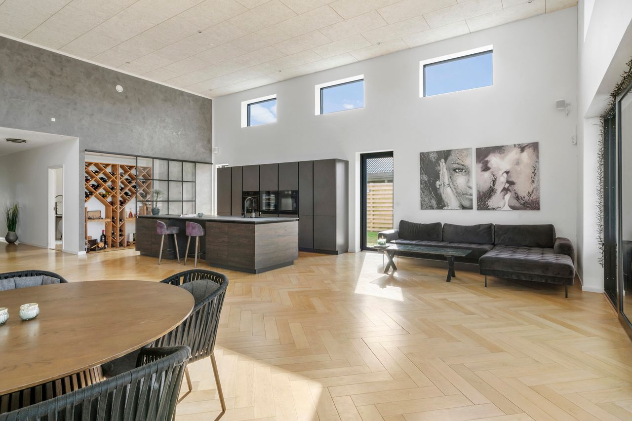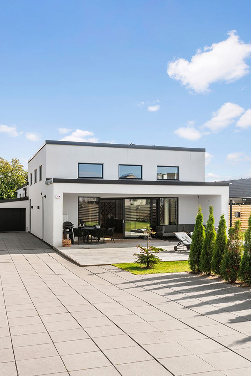 Allerede udefra imponerer villaen med sit funkisinspirerede udtryk, og indenfor fortsætter den gode stil, der er gennemgående i alle rum. Materialevalget er i en liga for sig, og sammen med den gennemtænkte planløsning giver det jer en bolig i klasse A.