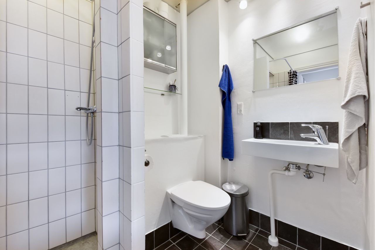 badeværelse med fliser og bruseniche og en stor og lys opholdsstue med flotte gulve. Fra stuen er der