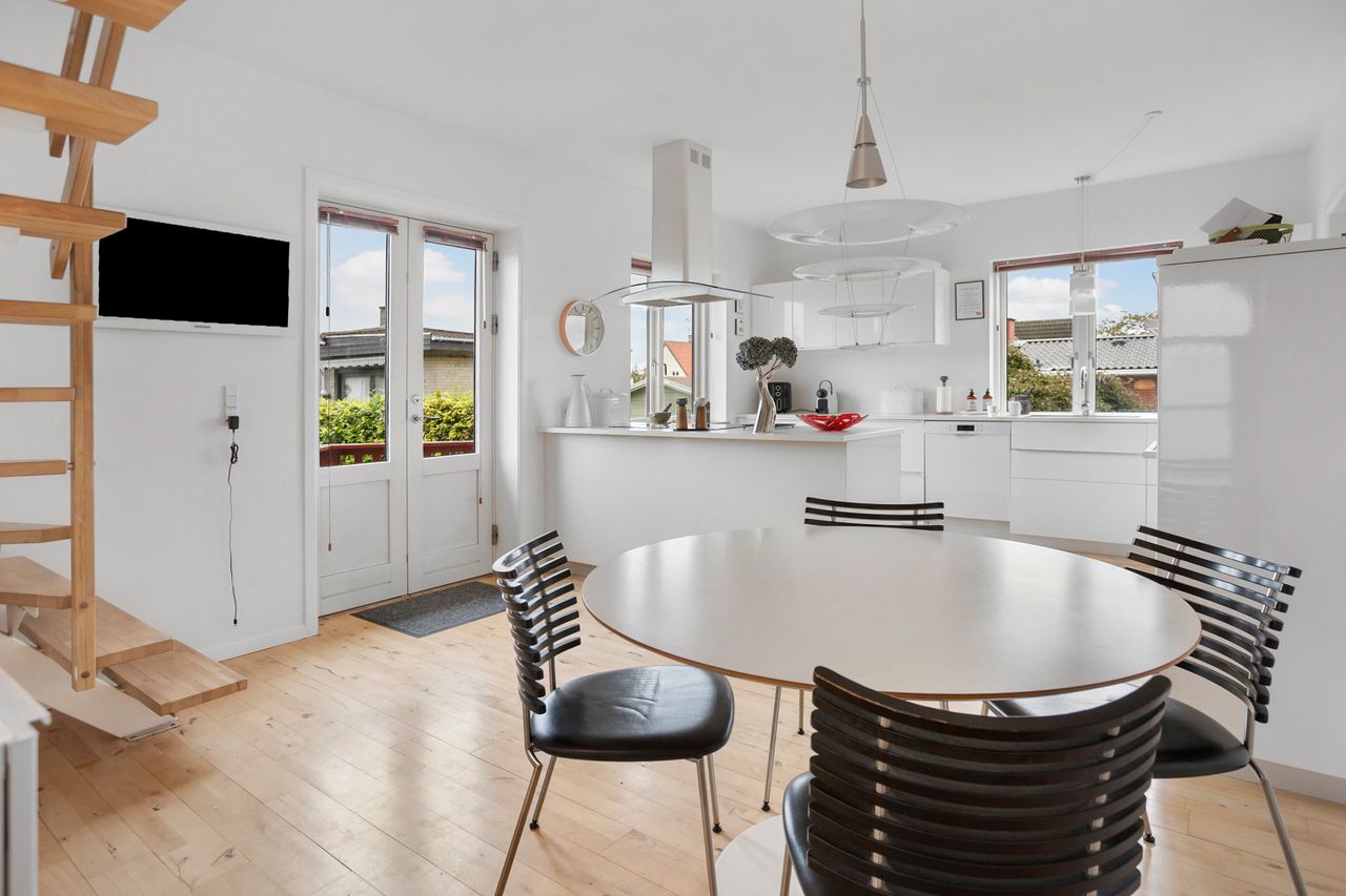 I stueplan har I de fælles opholdsrum, som består af tre rum med et godt flow imellem. Fra køkkenalrummet er der halvåbent til en mindre stue, som kan være jeres spisestue, og derfra er der fløjdøre ind til den større opholdsstue, hvorfra I fortsætter videre ud på terrassen med træbelægning og hyggelige forhold. Der er også et badeværelse i stueplan, som er placeret tæt på trappen, så det er nemt at komme til det fra værelserne ovenpå. Der er også et badeværelse på første sal, som er integreret i voksenafdelingen, hvor der udover bad er garderobe og soveværelse. I får også et alrum heroppe, der ligger i fuld husbredde med lysindfald fra to sider. Og på den anden side af dette ligger de to lige store børneværelser.
