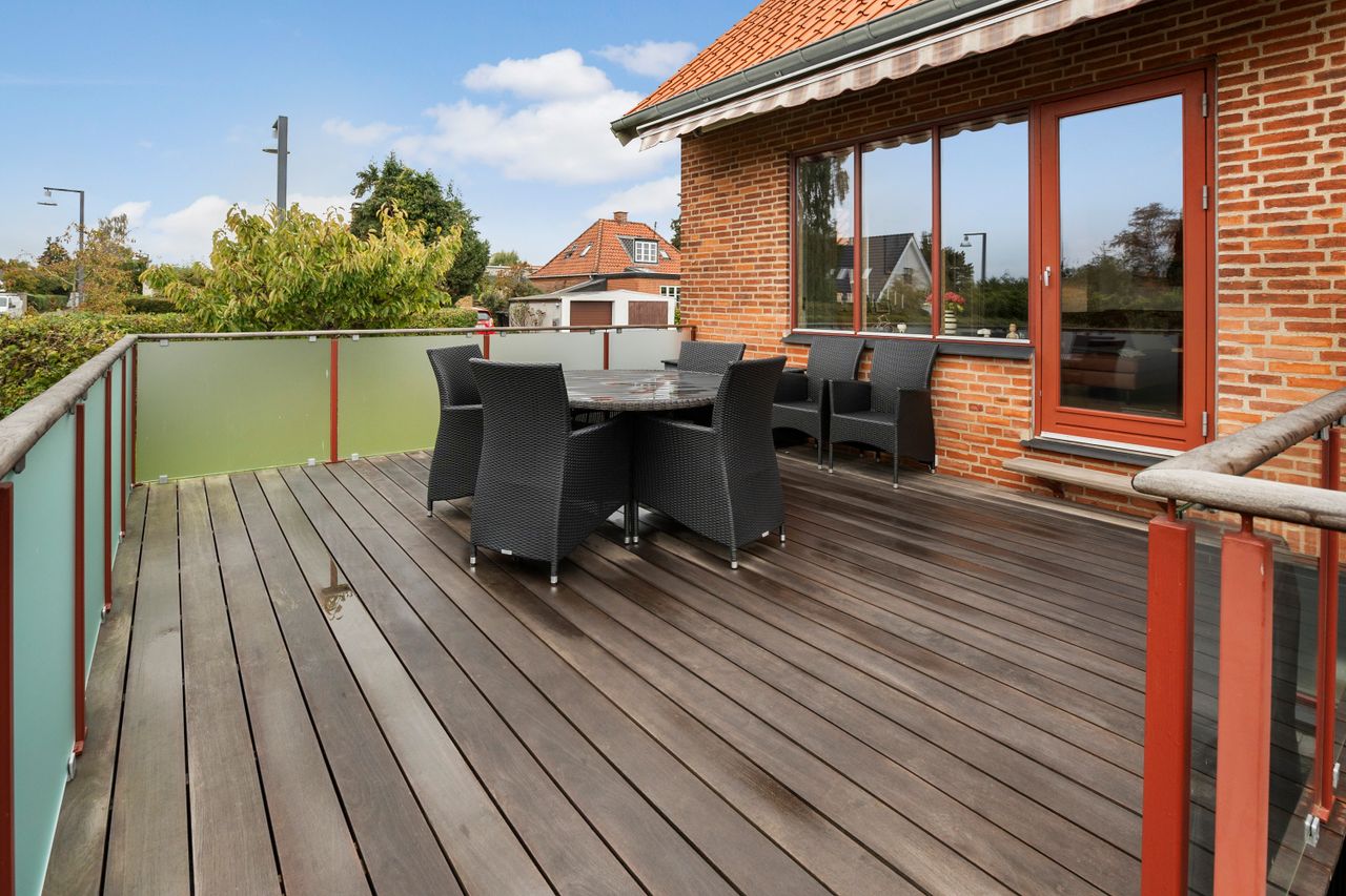 Grunden er på 699 kvadratmeter og meget hyggeligt indrettet med to terrasser i forskellige niveauer. Den ene ligger hævet over niveau med udgang fra stuen og er forsynet med en bred markise. Haven er enkelt anlagt og nem at holde. Her er enkelte træer blandt andet et æbletræ, der hvert år er garant for en generøs høst. På grunden er der både et redskabshus bag i haven med to rum og en rummelig garage med el-port foran huset.