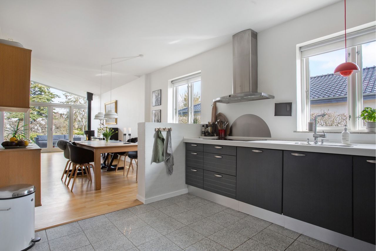til kip og panoramavinduer ud til terrassen og haven. Lysindfaldet gennem vinduespartierne er