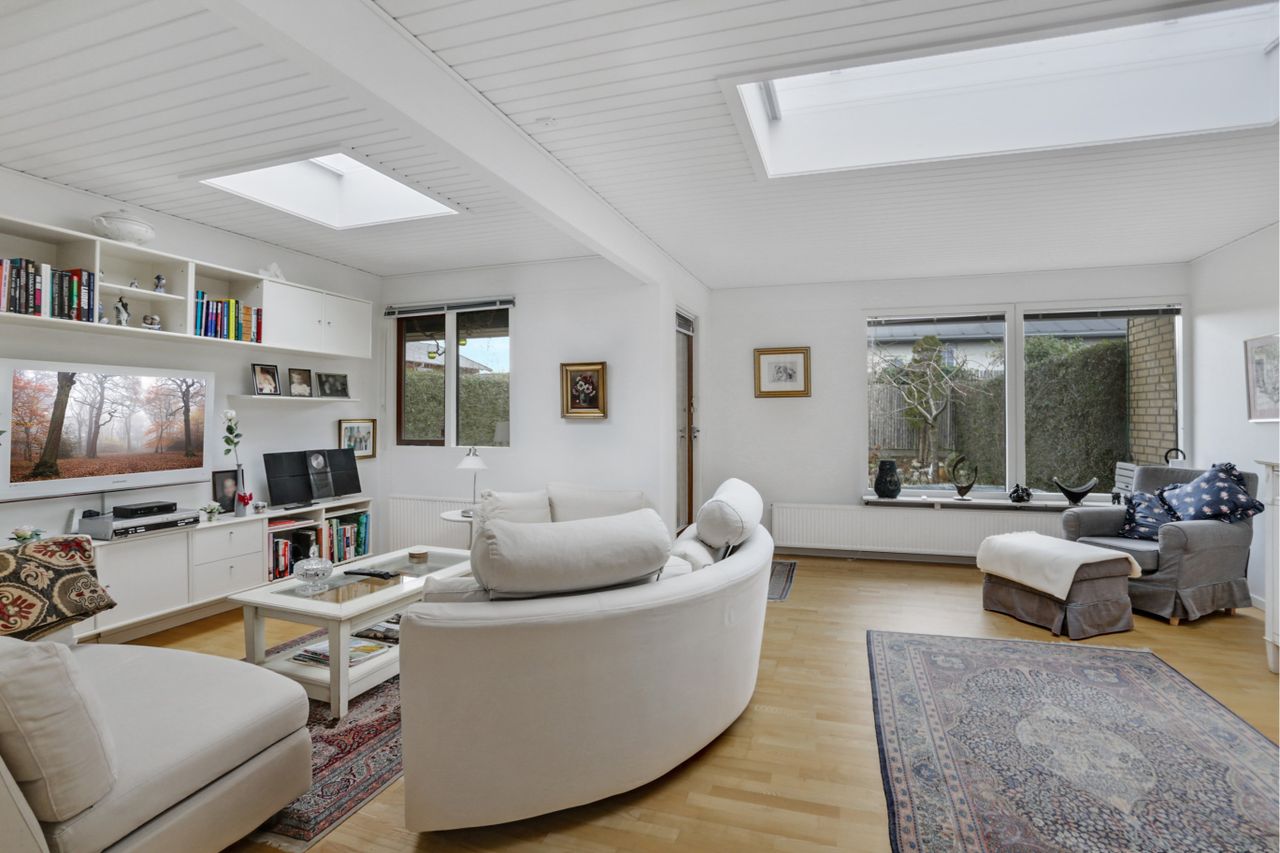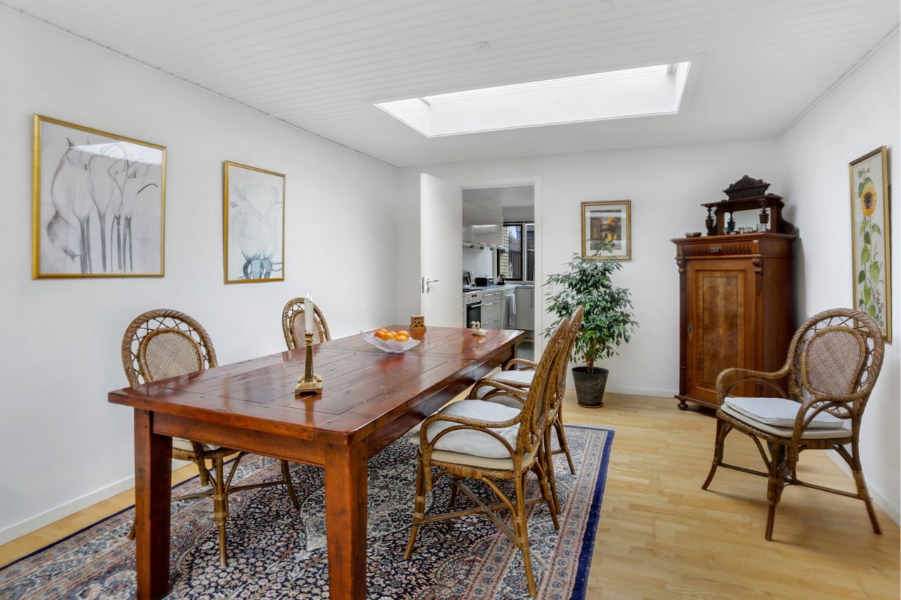 indrettes både med spisestue og dagligstue. Køkkenet ligger ved siden af, og det er opført i tidløse, hvide