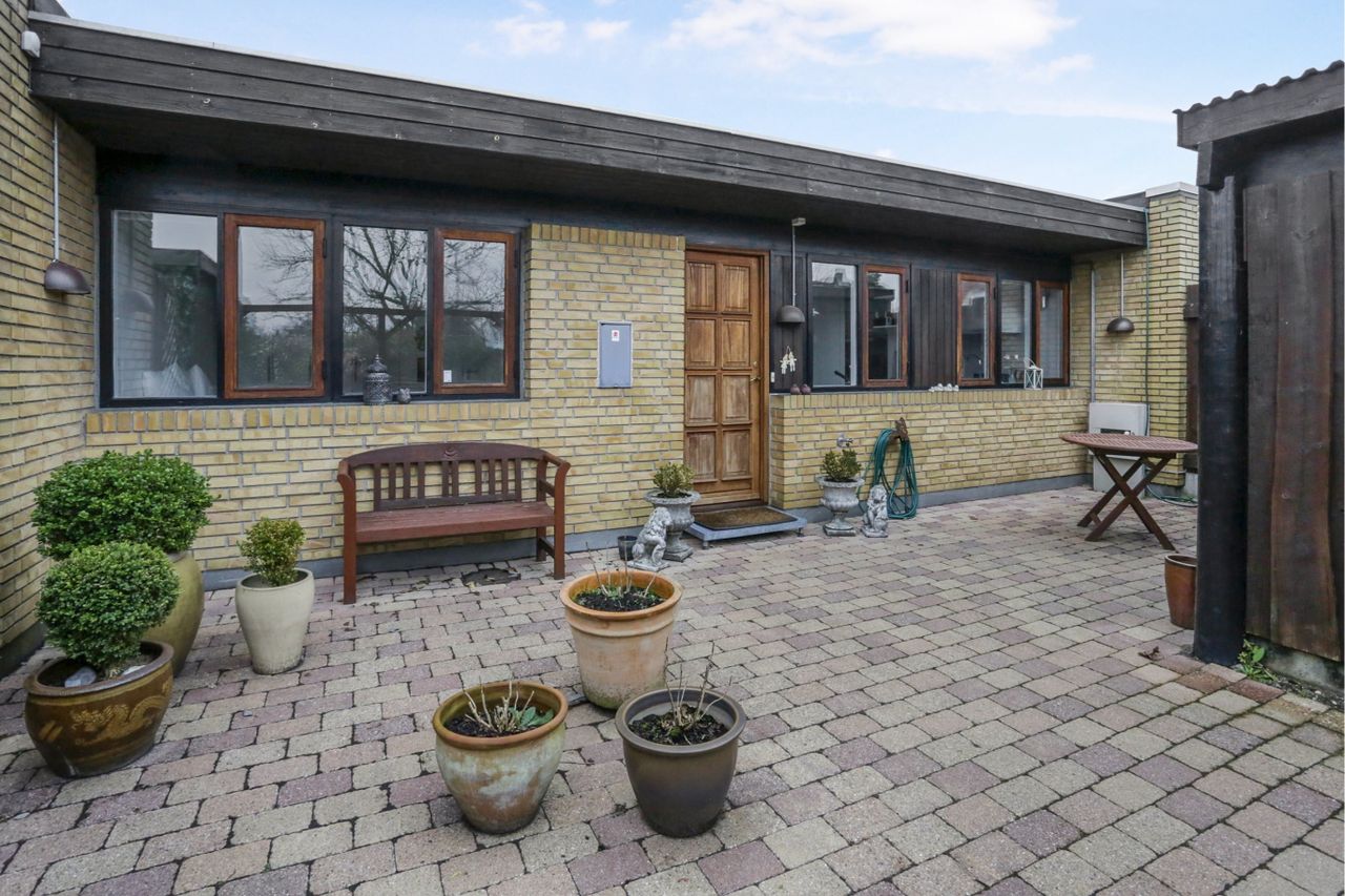 ud hele vejen omkring ejendommen. Her går det hele op i en højere enhed. Haven er flot anlagt med
