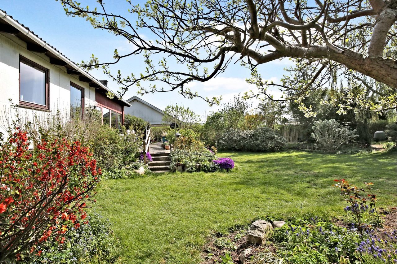 omkranset af en lukket havegrund, som er virkelig dejlig. Den er nemlig flot anlagt med kulørte