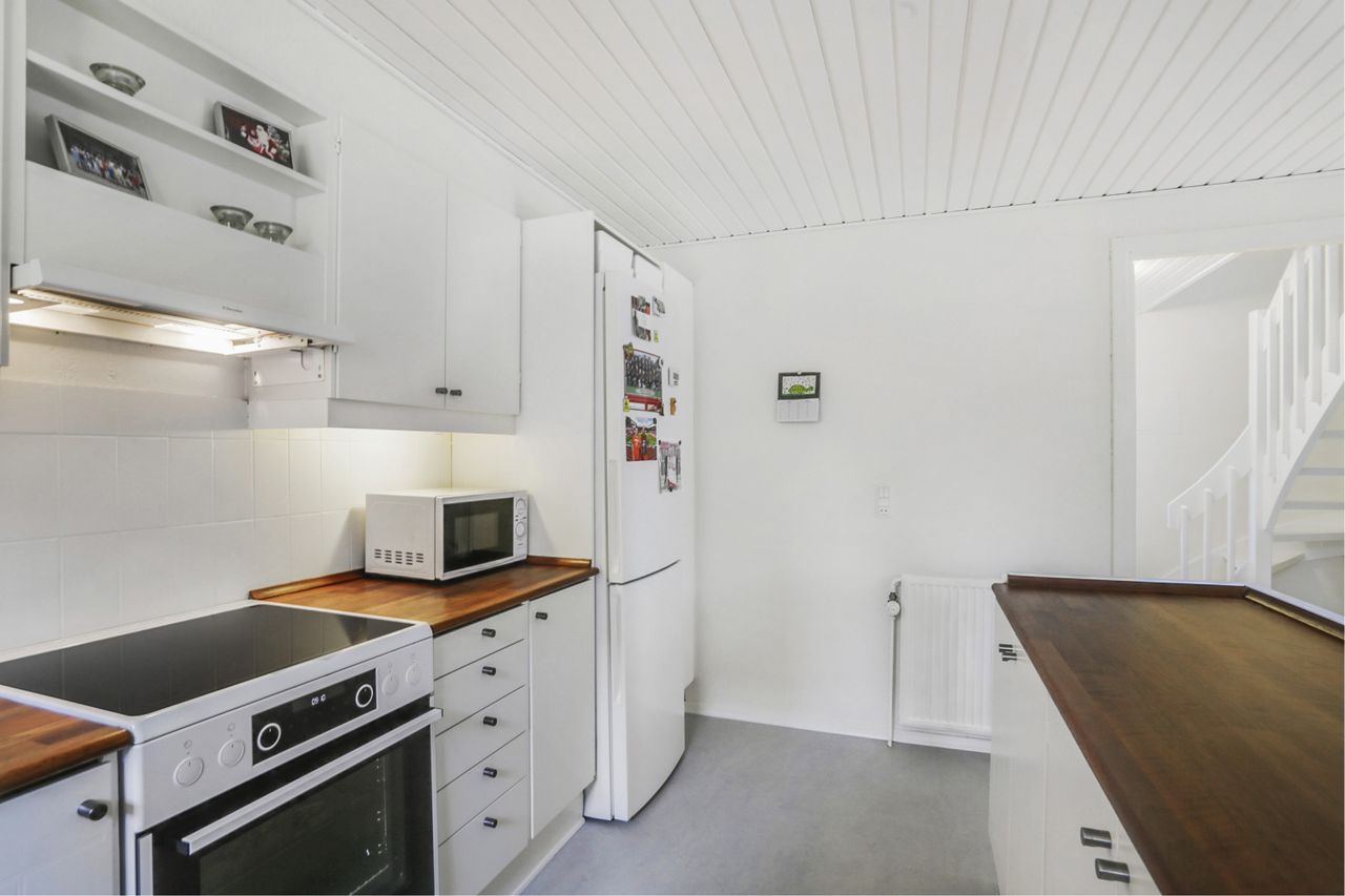 indflytningsklar, lys og imødekommende i stilen med hvidmalede vægge, lofter, døre og trappe. Og så er