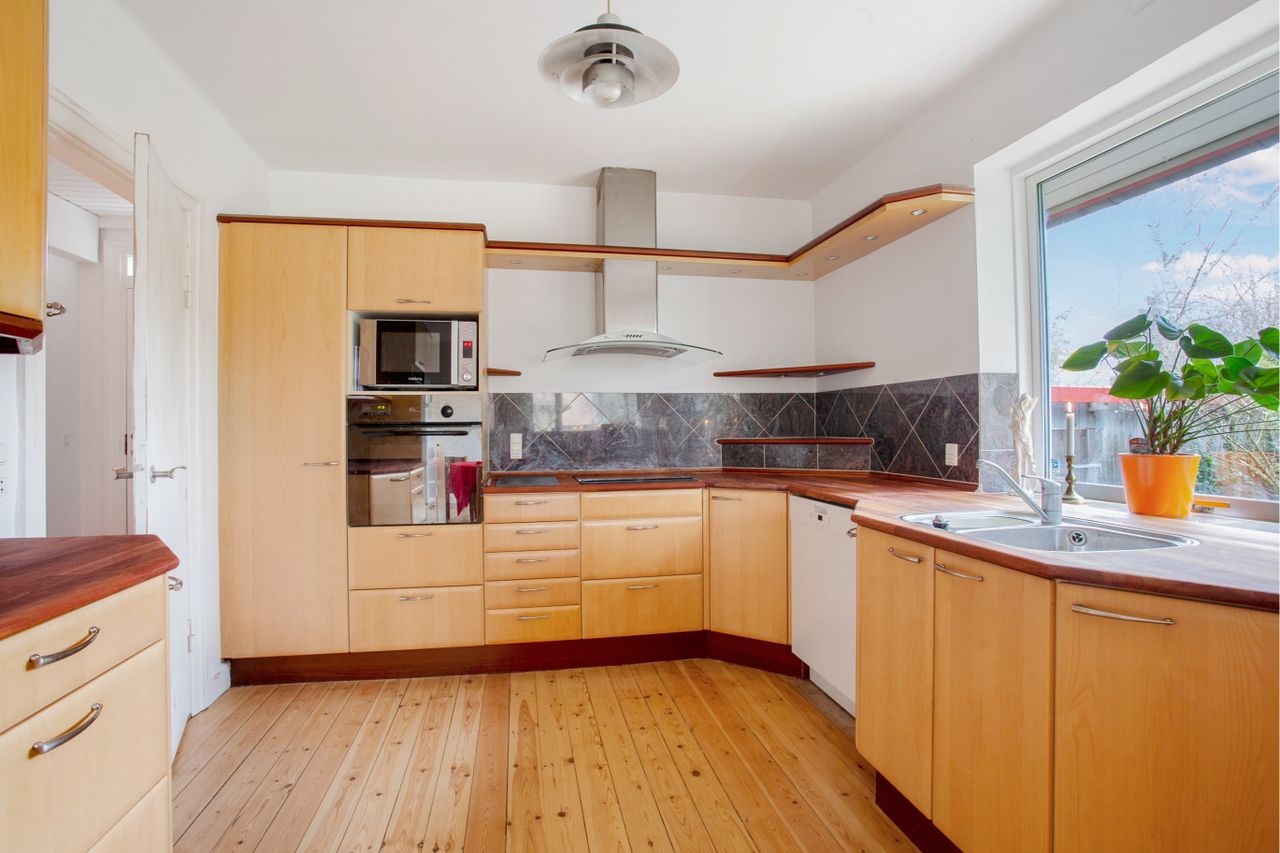 indflytningsklar stand – her er nemlig lyse trægulve, hvidmalede vægge og store vinduespartier. I