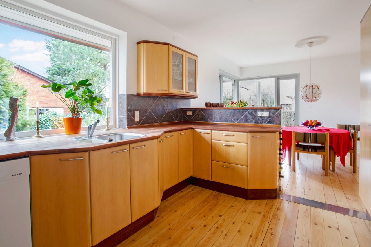 virkelig god størrelse, og de gyldne træelementer prydes af integrerede hårde hvidevarer. Alrummet ligger