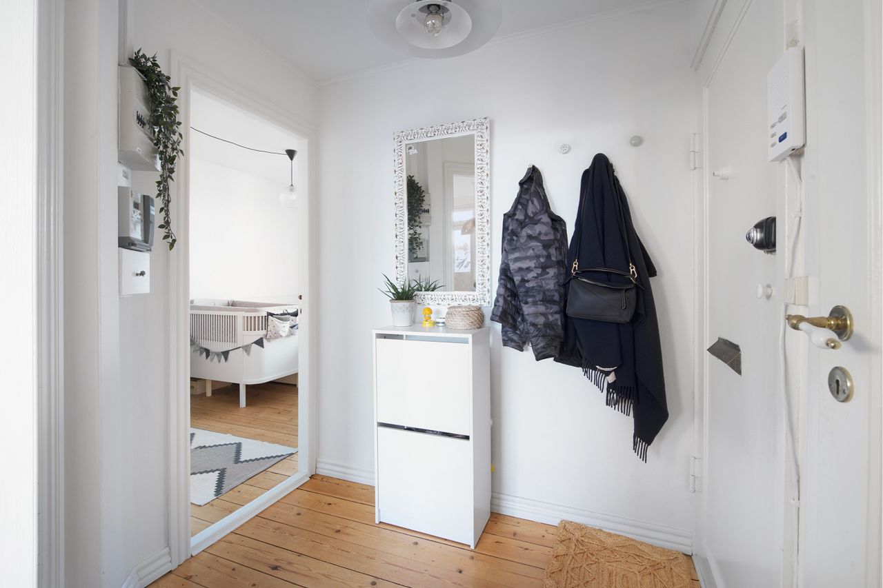 fordelingsentré, der åbner op for boligen. Herfra kan turen gå til badeværelset med brus og hvide klinker