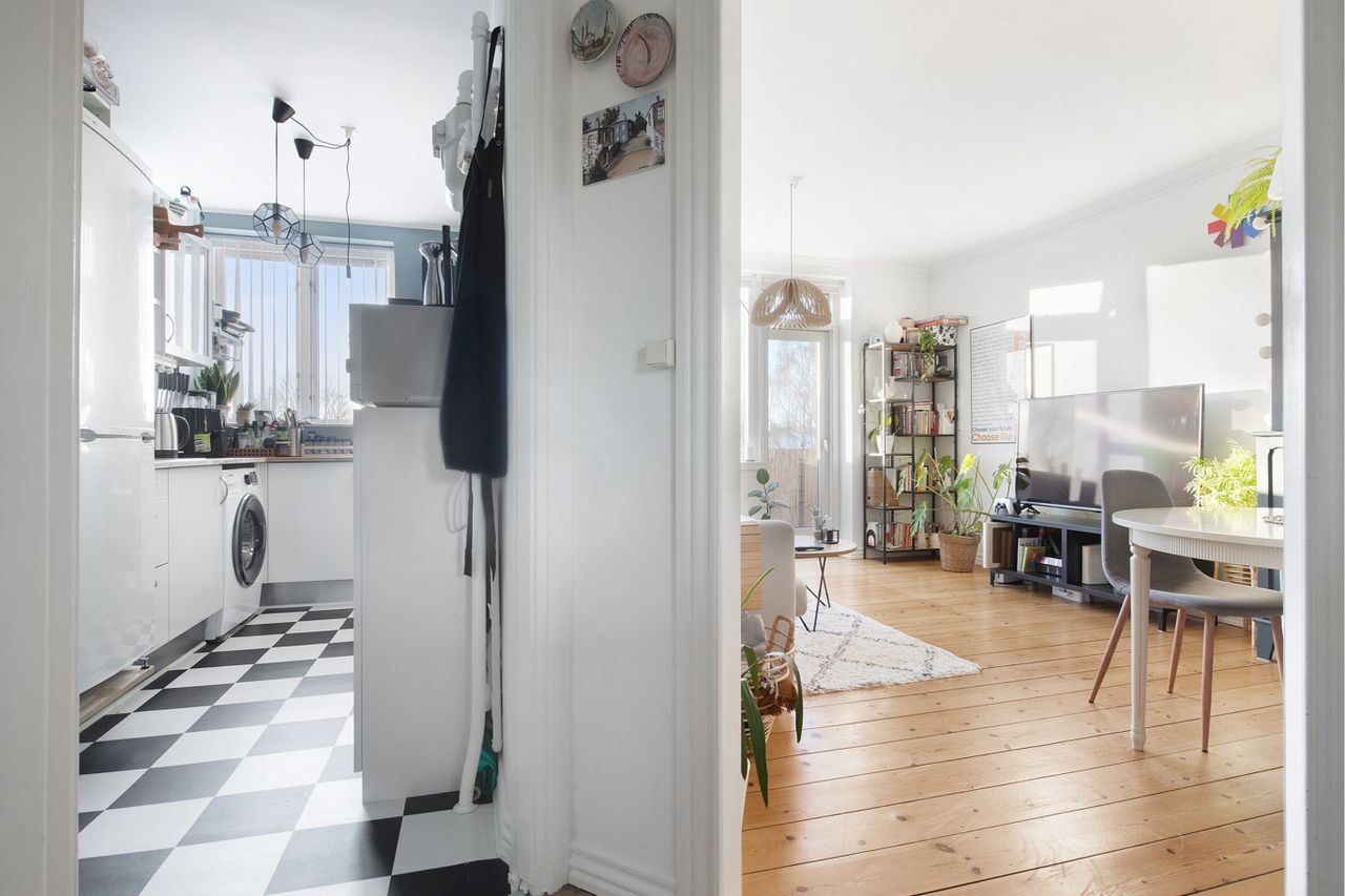 Lejligheden befinder sig på anden sal i en lys murstensejendom fra 1934, hvis facade bliver brudt af