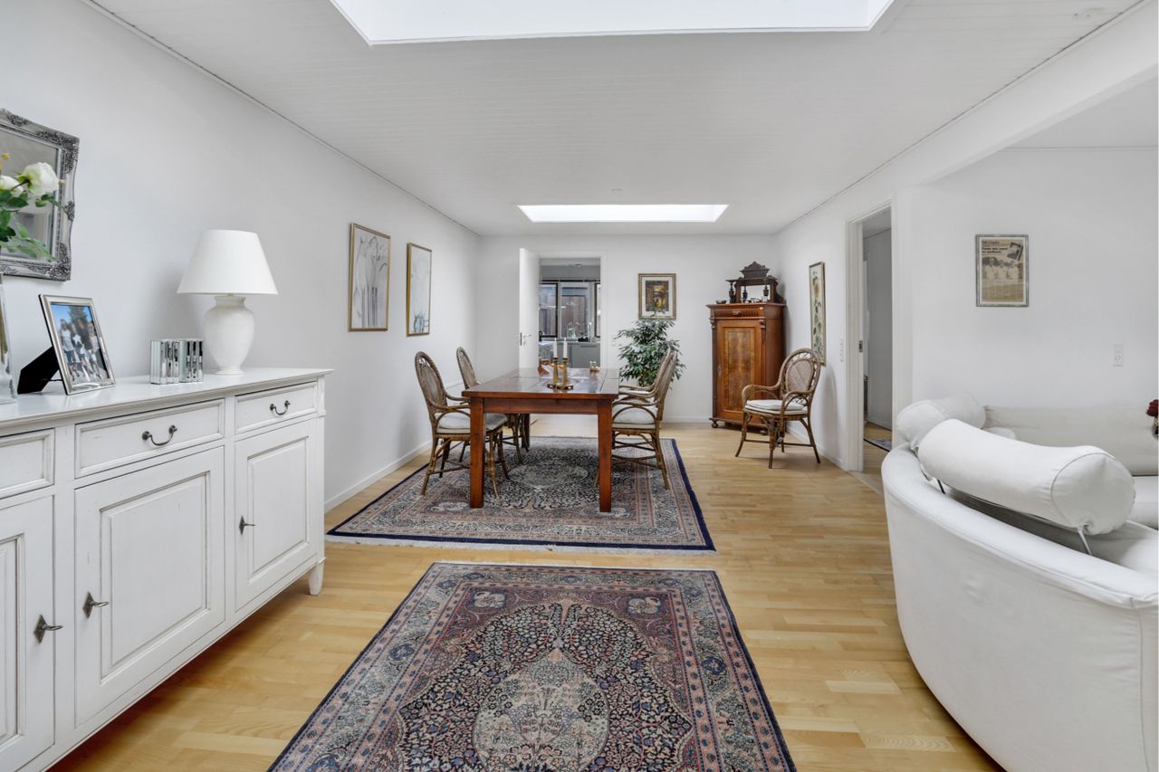 indrettes både med spisestue og dagligstue. Køkkenet ligger ved siden af, og det er opført i tidløse, hvide